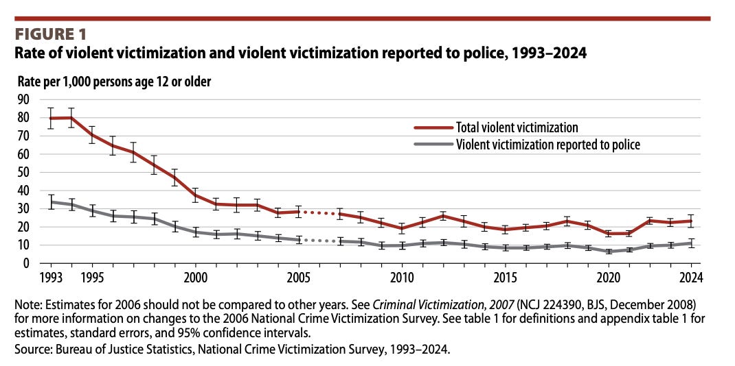 The recently released Bureau of Justice Statistics’ Criminal Victimization, 2024 report finds little year-to-year change in the nation’s violent crime rate, which stood at 23.3 incidents per 1,000 persons age 12 or older. Roughly 1.45% of Americans reported being victims of violent crime—statistically unchanged from 2023. About 48% of violent victimizations were reported to police, up slightly from 45% the prior year, and firearm-related incidents accounted for roughly 10% of all violent crimes. Property crime also remained stable at 97.6 per 1,000 households. The findings, based on the National Crime Victimization Survey, underscore that while police-reported crime has fallen in many categories, self-reported victimization has not seen a corresponding decline. 📈 Report here