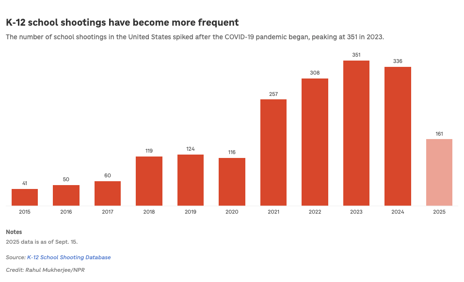 NPR reports that the country is confronting parallel crises — a rise in politically motivated attacks like the assassination of Charlie Kirk in Utah, and a surge in school shootings, such as the recent incident in Colorado that critically wounded two students. Researchers say mass shootings remain a small share of gun deaths, but their frequency has climbed in recent decades, with school-related incidents reaching record levels since the pandemic. At the same time, experts warn that political violence is increasingly mainstreamed into public life. “Just in the last 12 months we’ve seen terrible, terrible examples of political violence,” said Joshua Horwitz of Johns Hopkins, noting that both trends reflect deeper instability straining communities and law enforcement across the country. 📈 More here